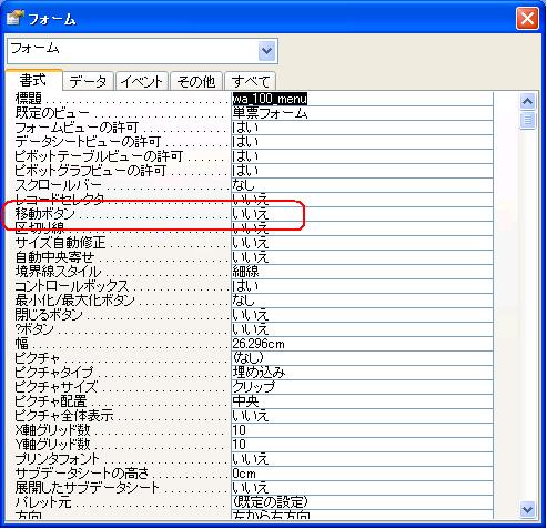 ' ' フォームのプロパティ、書式タブ、[移動ボタン]を、 ' はい: 移動ボタンを表示する。 ' いいえ: 移動ボタンを表示しない。 '