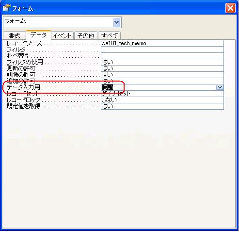 新規入力専用のフォームにするには、 フォームのプロパティ、[データ]タブ、[データ入力用]プロパティを「はい」にします。