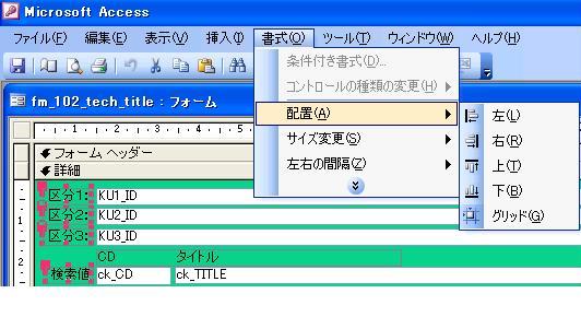 コントロールを整列する。 コントロールを選び、[書式]−[配置] をクリックする。