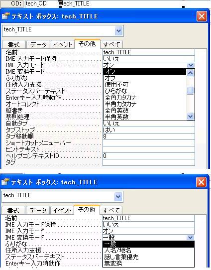 1.変更したいテキストボックスを選択します。 2.プロパティ、[その他]タブ − [IME 入力モード] [IME 変換モード] の▼より選択します。