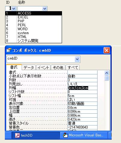 コンボボックスの特定の列を表示したくない場合は、 その列の[列幅]プロパティで、値を 0 に設定します。 この例では、IDの列幅を 0 に設定し、CDと名称を表示しています。