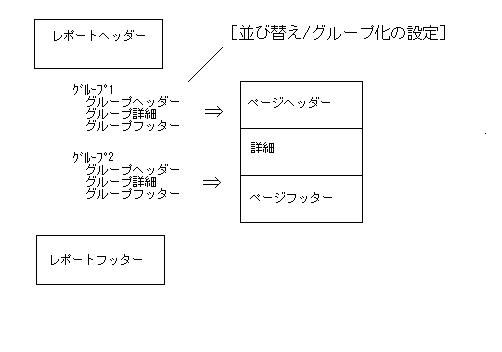 レポートは、下記のような概念で構成されている。 レポートヘッダー:表紙 ページヘッダー:1ページ内の見出し部(帳票タイトル等) 詳細:データ部 ページフッター:1ページ内の最下位固定部(章タイトル、ページ) レポートフッター:裏表紙 一般的な事務処理上の帳票の概念とは違っているので注意すること。