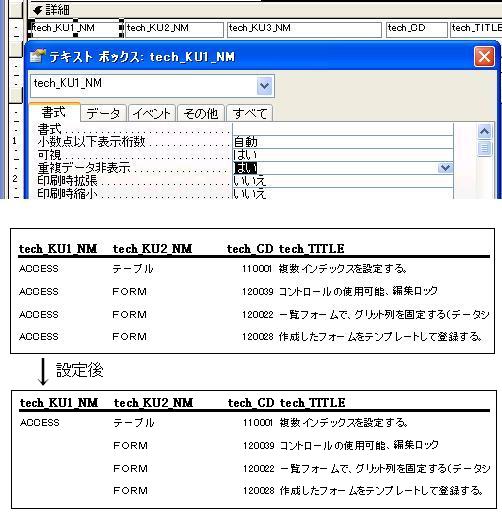 重複するデータを非表示にするには、 1.非表示にしたい項目のプロパティを開きます。 2.[重複データ非表示]プロパティを 「はい」にします。