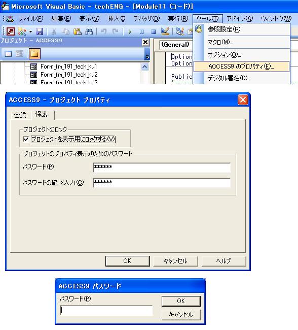 プロジェクトにパスワードをつけることで、他人にモジュールを見られないようにできます。 1.VBEで、[ツール]−[プロパティ]をクリックします。 2.[保護]タブで、 [プロジェクトを表示用にロックする(V)] にチェックをいれ、 パスワード を入力します。 [OK] をクリックします。 3.次にACCESSを立ち上げたときから有効になります。