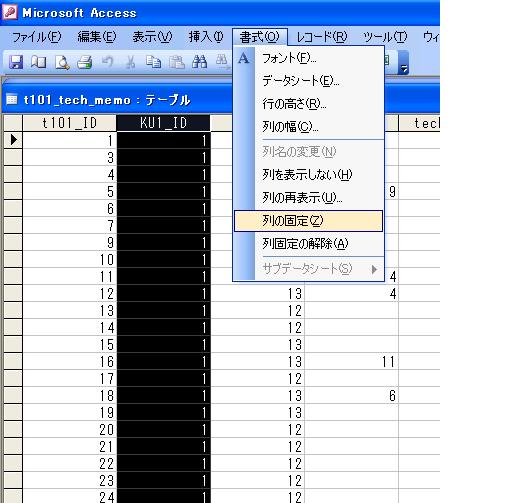 データシートを表示しているとき、[書式]−[列の固定]で列の固定ができます。 解除するには、[書式]−[列の固定解除]
