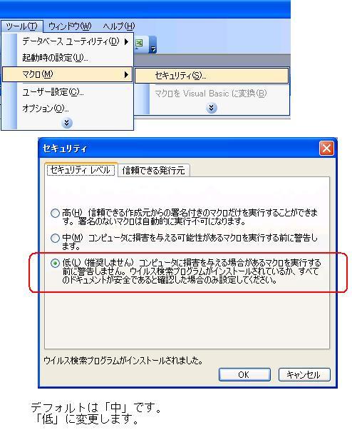 ACCESS2002,2003で運用上、「セキュリティ警告」を出ないようにするには、 「ツール」−「マクロ」−「セキュリティ(S)]で、セキュリティレベルを「低」にします。