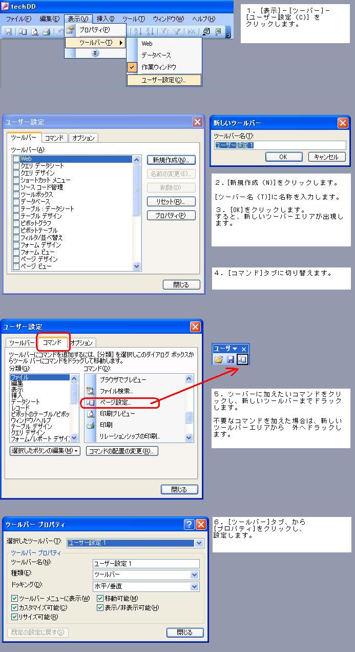 1.[表示]−[ツールバー]−[ユーザー設定]をクリックします。 2.[新規作成(N)] をクリックします。 3.ツールバー名を入力し、[OK] をクリックします。 新しいツールバーエリアが出現します。 4.[コマンド]タブをクリックします。 5.加えたいコマンドを 新しいツールバーエリアにドラックします。 誤って加えた場合は、新しいツールバーエリア以外へドラックします。 希望するツールバーができるまで繰り返しドラックします。 6.ツールバーを配置した居場所にドラックします。 7.[ツールバー]タブ、[プロパティ]をクリックし、設定します。 作成したツールバーそのものが不要な場合は、ツールバー名をクリックし、[削除]をクリックします。